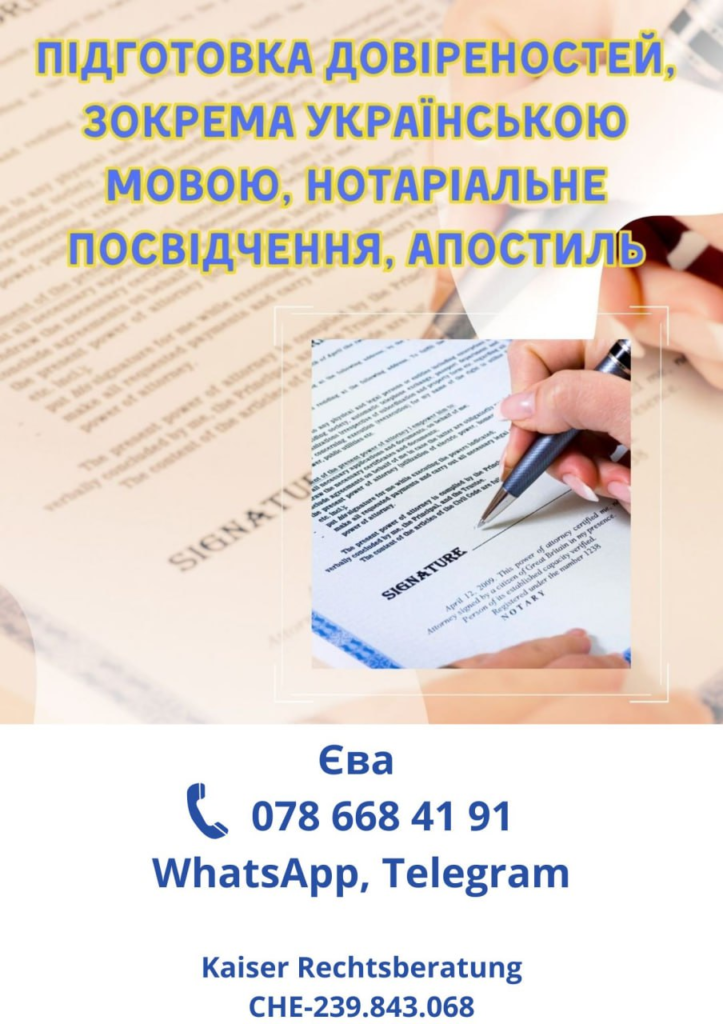 Довіреність, засвідчена у Швейцарії та апостильована, має повну юридичну силу в Україні. Процес складається з двох кроків: 1. Засвідчення підпису та 2. Апостиль. І саме на першому кроці можна заощадити.